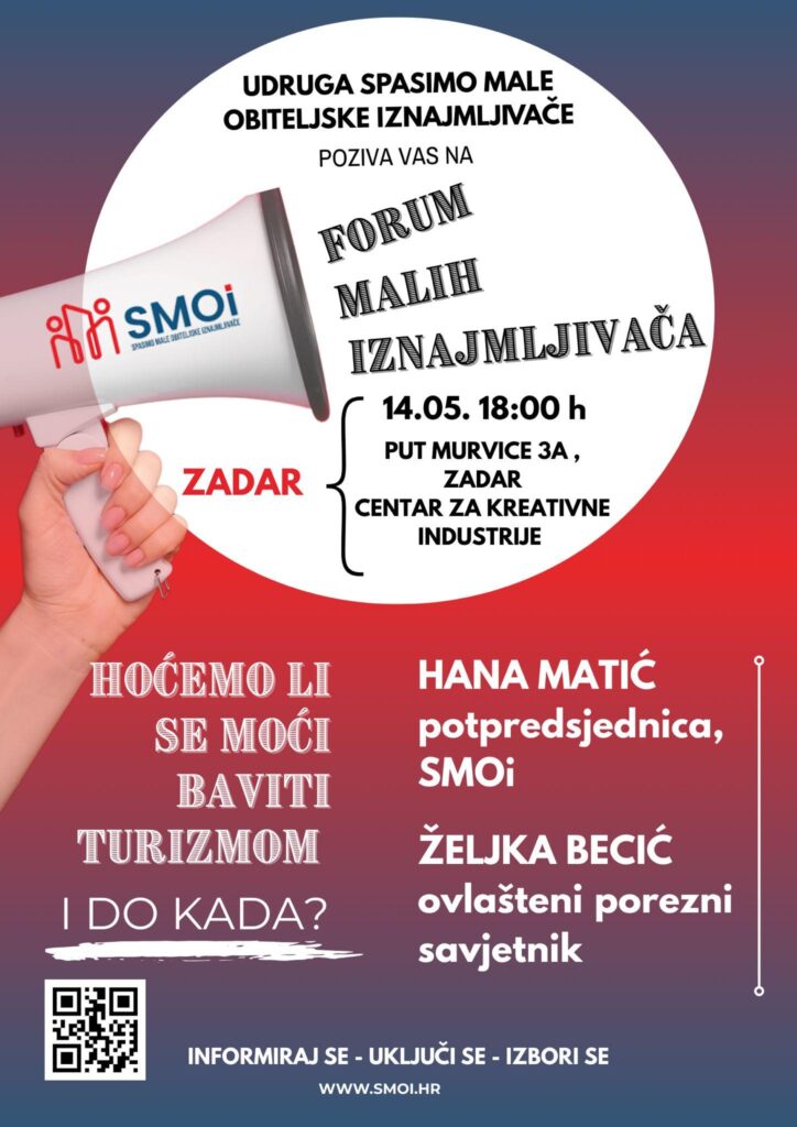 14. svibnja 2025. pred punom dvoranom u Centru za kreativne industrije u Zadru održan je Forum malih iznajmljivača znakovitog naziva “Hoćemo li se moći baviti turizmom – i do kada?”. Ovo je već peta tribina u organizaciji Udruge Spasimo male obiteljske iznajmljivače (SMOI) održana u posljednjih mjesec dana, a na kojima je prisustvovalo više stotina malih iznajmljivača u Splitu, Rijeci, Puli i Zagrebu.