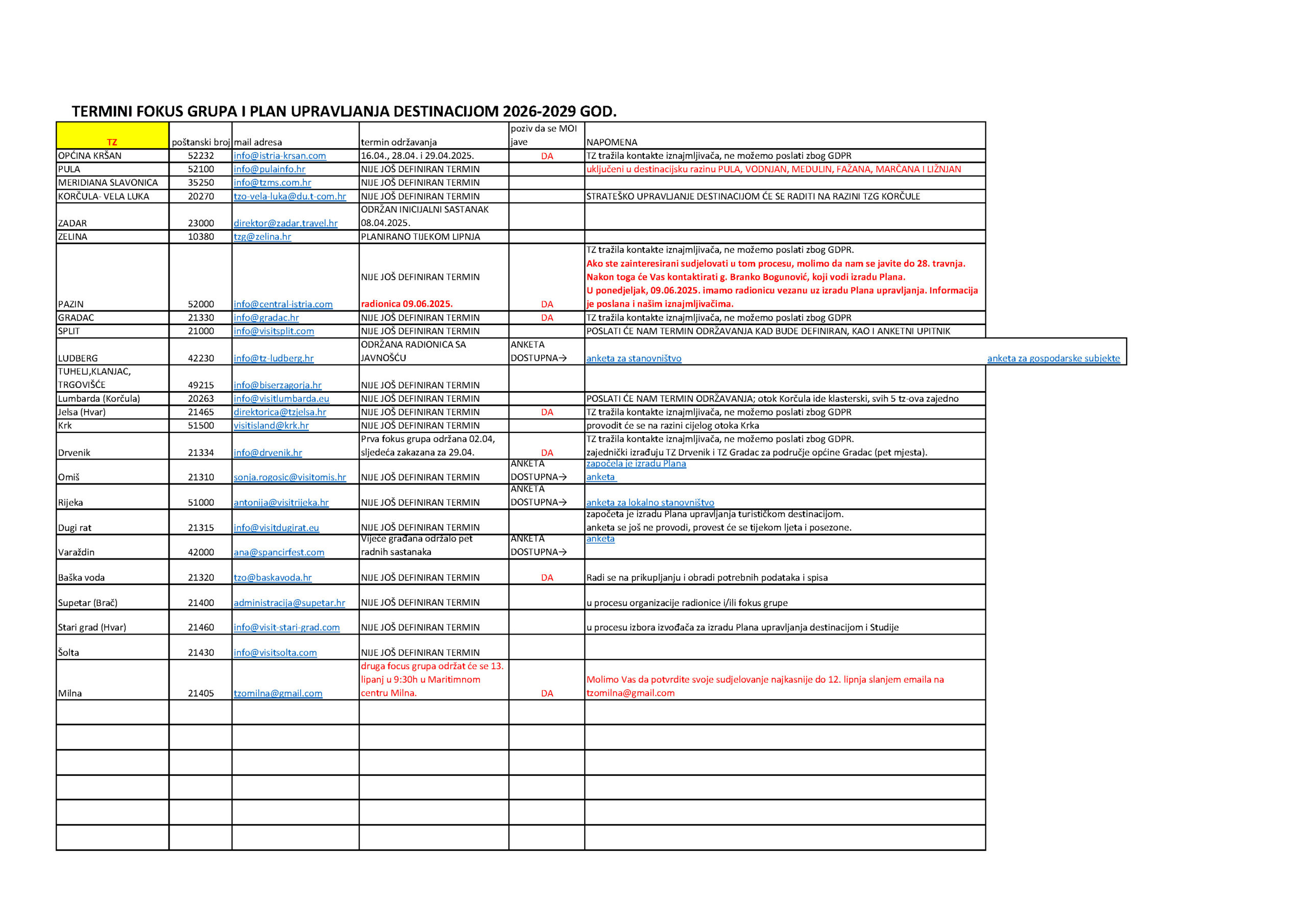TERMINI FOKUS GRUPA I PLAN UPRAVLJANJA DESTINACIJOM 2026-2029 GOD. – ažurirano 09.06.2025.